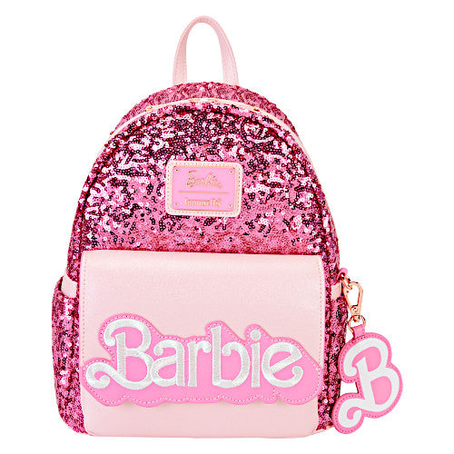 This exclusive Loungefly Barbie Logo Sequin Mini Backpack uses sequin, iridescent, and glitter details to create a style that shines. The classic Barbie™ logo nods to Barbie’s original flair, elevating the bag with a die-cut flap pocket, bag charm, and printed strap webbing. This backpack is an officially licensed Barbie product measuring approximately 9” W x 10.5” H x 4.5” D.