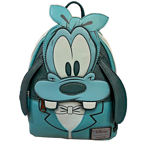 The exclusive Loungefly Goofy Christmas Carol Mini Backpack features Goofy as the iconic Jacob Marley from Mickey's Christmas Carol. This officially licensed Disney bag glows in the dark and is highlighted by layered appliqués including chains on the side pockets, printed details on the straps, and themed interior lining.