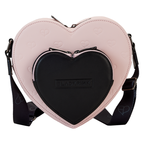 Play up your look effortlessly. Show off your true colors with our Loungefly BLACKPINK All-Over Print Heart Crossbody Bag. Fall in love with this sleek and elegant accessory, which is shaped like a pink heart, with an all-over debossed print pattern of hearts. On the front, a smaller, fully figural heart-shaped zipper compartment in black displays the debossed BLACKPINK logo. Black shoulder straps—and black trim—complement the soft pink color of the crossbody bag.